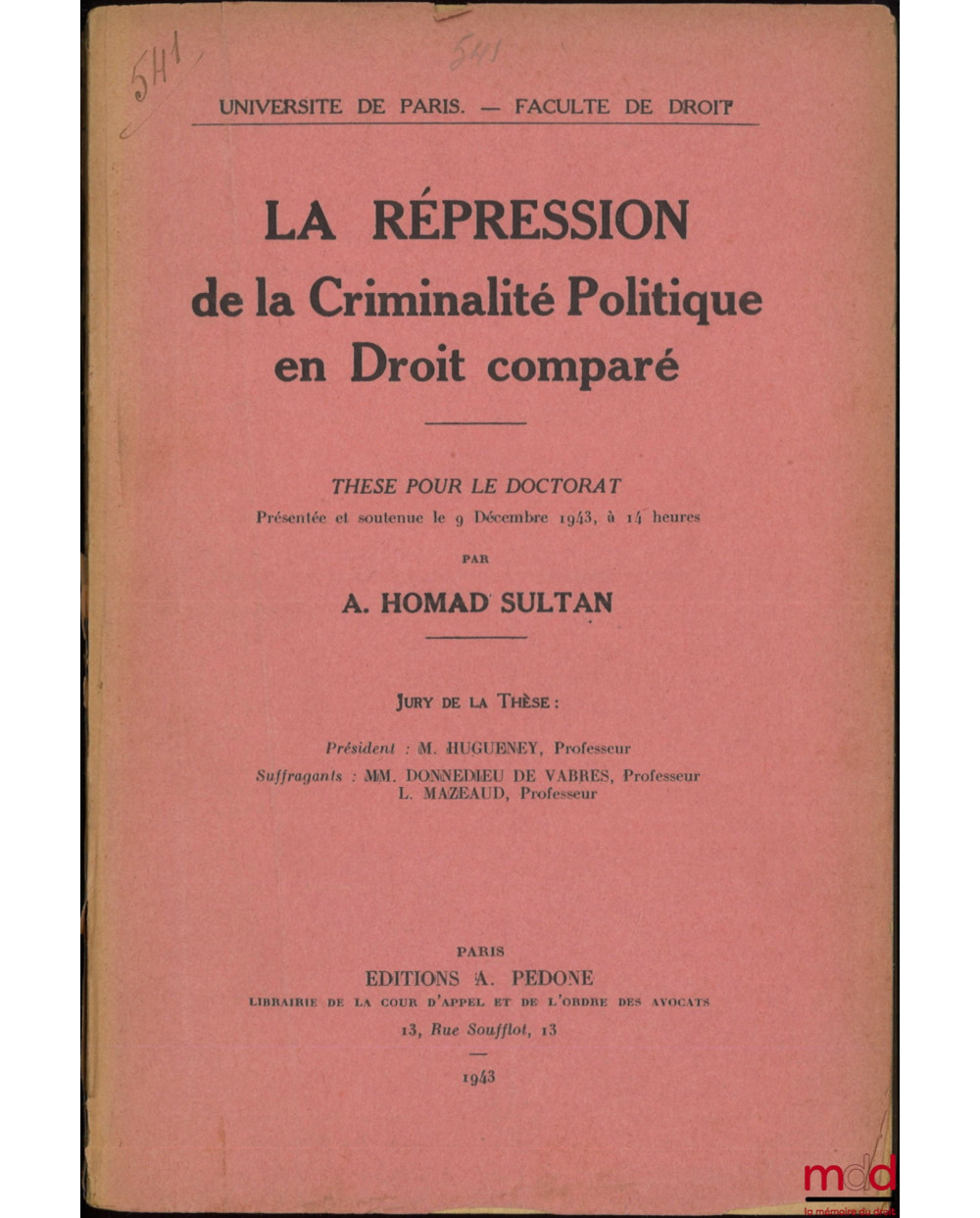 LA RÉPRESSION DE LA CRIMINALITÉ POLITIQUE EN DROIT COMPARÉ, Thèse (Président : Hugueney ; Suffragants : Donnedieu de Vabres, Mazeaud)
