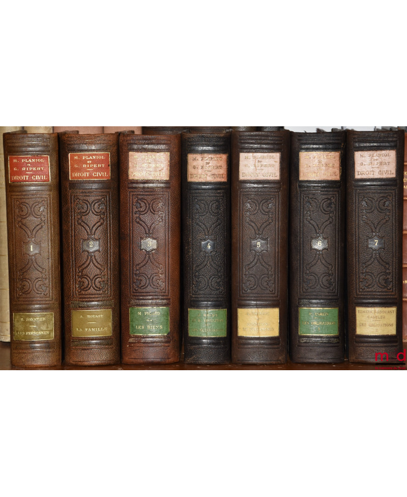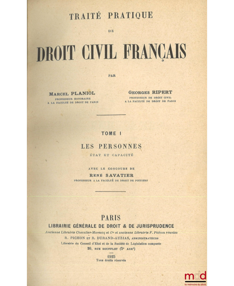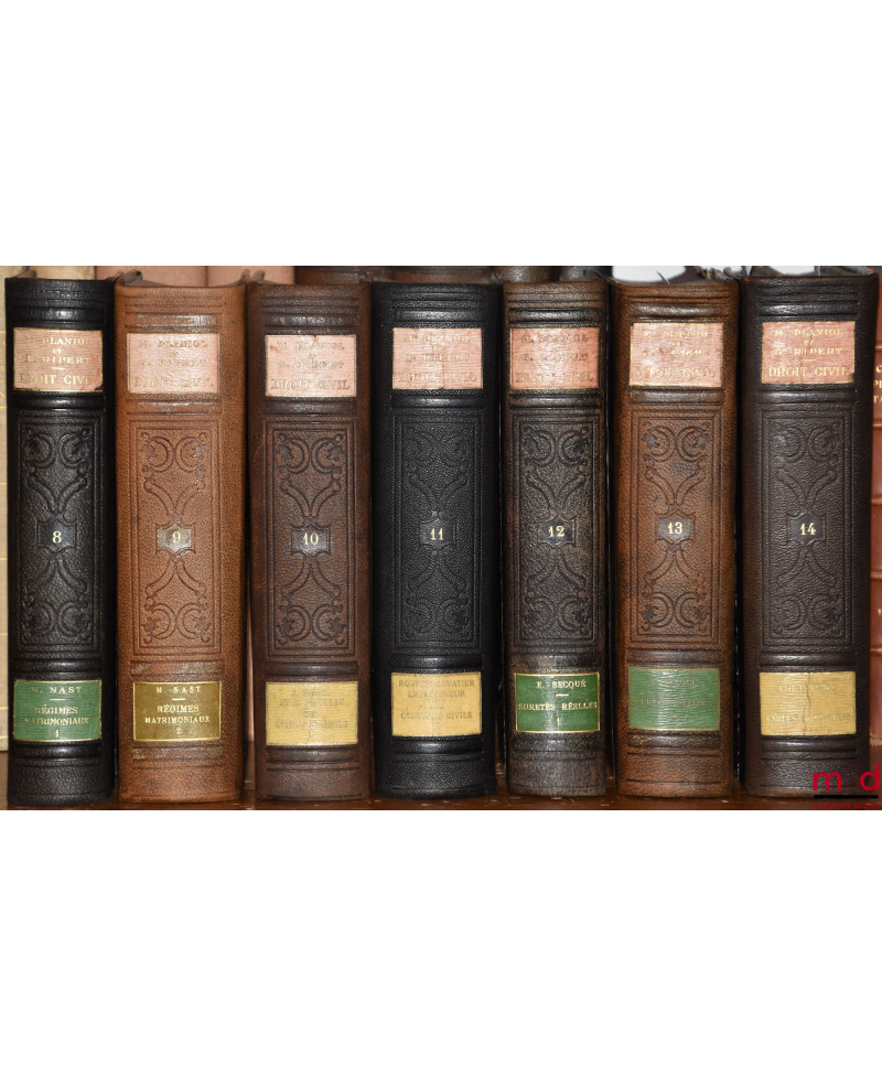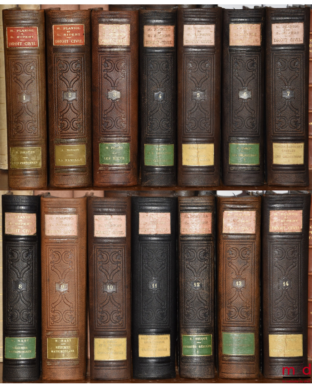 TRAITÉ PRATIQUE DE DROIT CIVIL FRANÇAIS, 1re éd. :t. I : Les personnes - État et capacité, Avec le concours de René Savatier (VIII-852 p.) ;t. II : La famille - Mariage, divorce, filiation, Avec le concours de André Rouast (938 p.) ;t. III : Les biens, Avec le concours de Maurice Picard (991 p.) ;t. IV : Successions, Avec le concours de J. Maury et H. Vialleton (852 p.) ;t. V : Donations et testaments, Avec le concours de André Trasbot (1030 p.) ;t. VI : Obligations première partie, Avec le concours de Paul Esmein (1103 p.) ;t. VII : Obligations deuxième partie, Avec le concours de Paul Esmein, Jean Radouant & Gabriel Gabolde (973 p.) ;t. VIII & IX : Les régimes matrimoniaux, Avec le concours de Nast (760 et 956 p.) ;t. X : Contrats civils première partie, Avec le concours de Joseph Hamel (vente) et Bernard Perreau (louage) (991 p.) ;t. XI : Contrats civils deuxième partie, Avec le concours de André Rouast, René Savatier, Jean Lepargneur (1039 p.) ;t. XII & XIII : Sûretés réelles par Emile Becqué (745 et 898 p.) ; t. XIV : Additions et tables générales (986 p.).