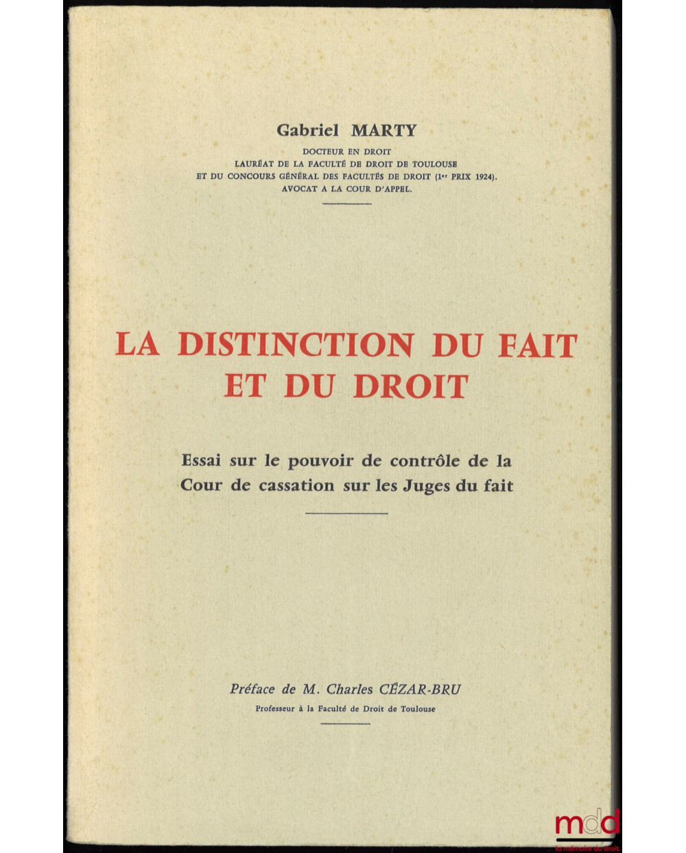 LA DISTINCTION DU FAIT ET DU DROIT. Essai sur le pouvoir de contrôle de la Cour de Cassation sur les juges du fait, thèse pour le doctorat