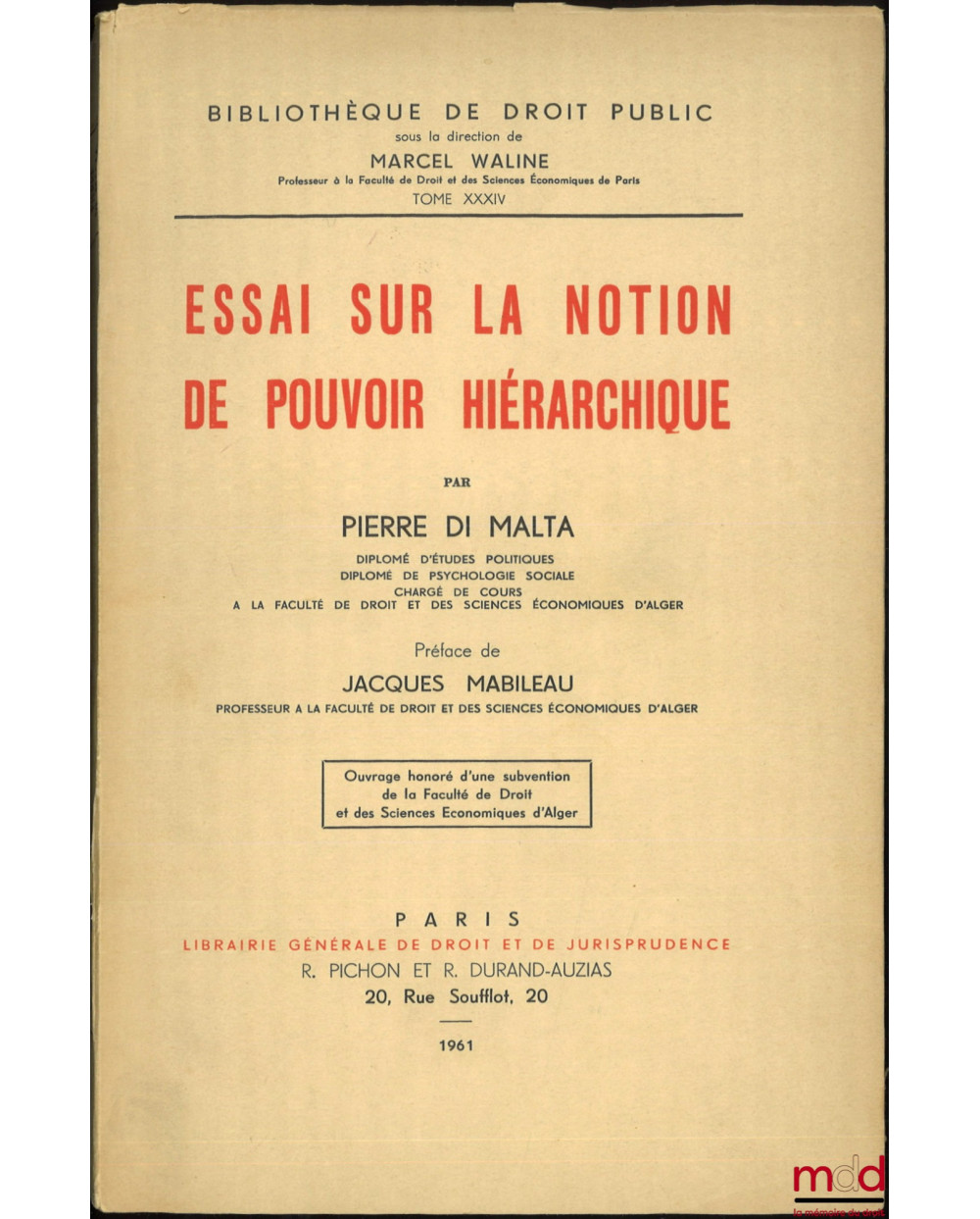 ESSAI SUR LA NOTION DE POUVOIR HIÉRARCHIQUE, Préface de Jacques Mabileau, Bibl. de droit public sous la direction de M. Waline, t. XXXIV