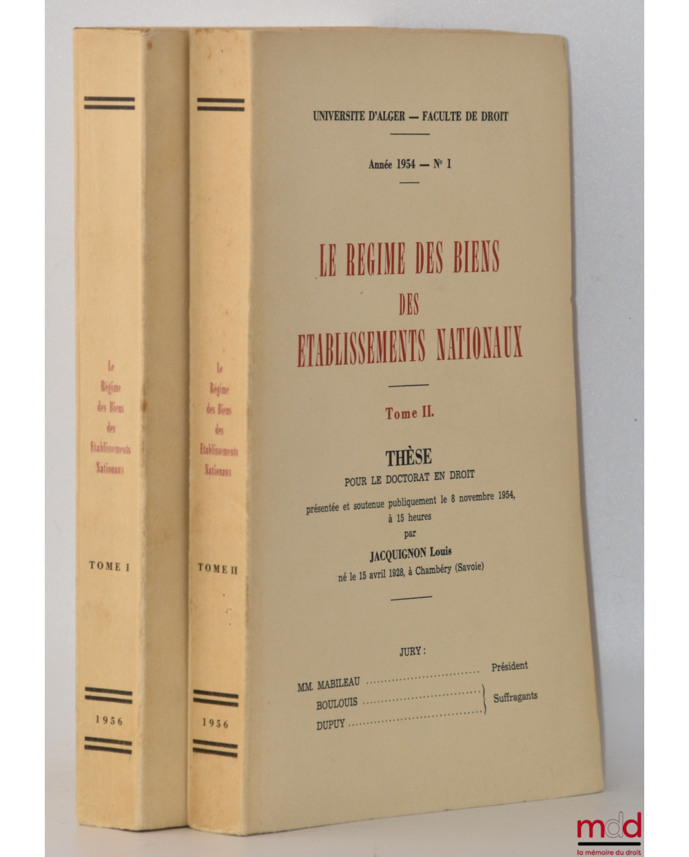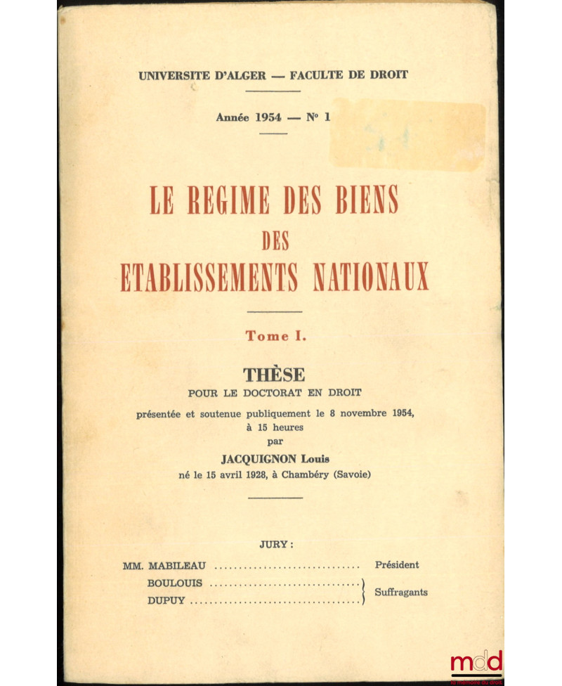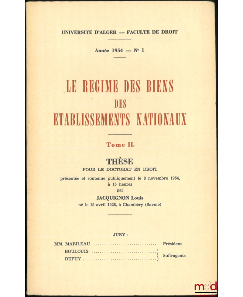 LE RÉGIME DES BIENS DES ÉTABLISSEMENTS NATIONAUX, Thèse, Université d’Alger, Faculté de droit, année 1954, n° 1