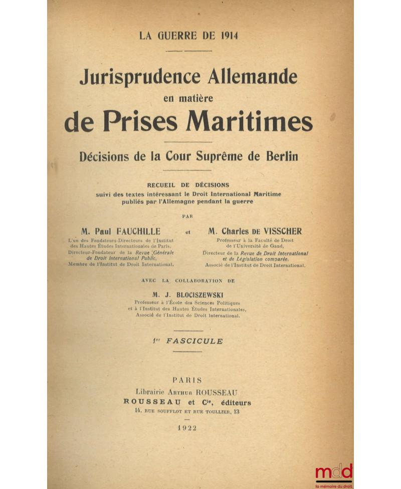 LA GUERRE DE 1914, Jurisprudence allemande en matière de prises maritimes, Décisions de la Cour suprême de Berlin, Recueil de décisions suivi des textes intéressant le droit international maritime, Avec la collaboration de M. J. Blociszewski, 1er fascicule [Seul]