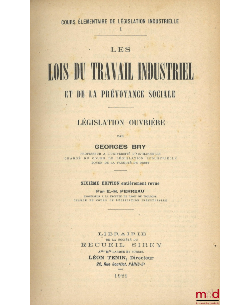 LES LOIS DU TRAVAIL INDUSTRIEL ET DE LA PRÉVOYANCE SOCIALE, Législation ouvrière, 6e éd. entièrement revue par E.-H. Perreau, Cours élémentaire de législation industrielle I