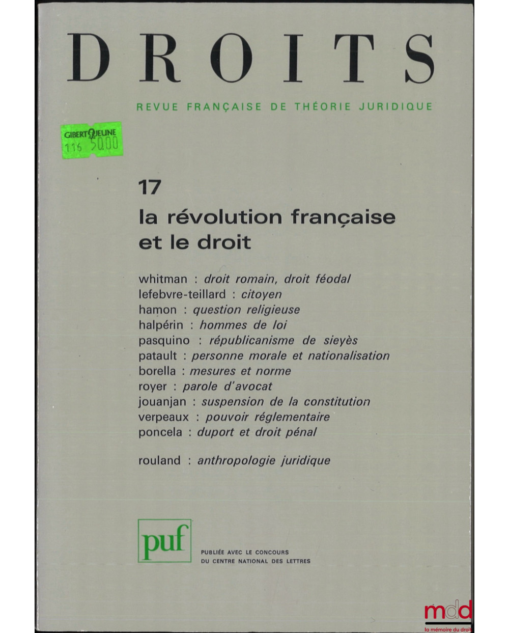 Livraison épuisée de la revue Droits qui contient notamment les articles de Olivier Beaud, Ouverture : L’histoire juridique de la Révolution française est-elle possible ? ; James Q. Whitman, « Les seigneurs descendent au rang de simples créanciers » : droit romain, droit féodal et Révolution ; Anne Lefebvre-Teillard, Citoyen ; Léo Hamon, La Révolution française et la question religieuse ; Jean-Louis Halpérin, Haro sur les hommes de loi ; Pasquale Pasquino, Le républicanisme constitutionnel de E. Sieyès ; Anne-Marie Patault, La personne morale d’une nationalisation à l’autre, naissance et mort d’une théorie ; François Borella, Le système métrique et la problématique des normes ; Jean-Pierre Royer, Parole d’avocat... Remarques sur la plaidoirie pénale, de la fin de l’Ancien Régime à la Révolution ; Olivier Jouanjan, La suspension de la Constitution de 1793 ; Michel Verpeaux Le pouvoir réglementaire sous la Révolution ; Pierrette Poncela, Adrien Duport, fondateur du droit pénal moderne.