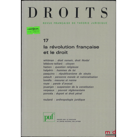 LA RÉVOLUTION FRANÇAISE ET LE DROIT, Droits, Revue Française de Théorie Juridique, n° 17