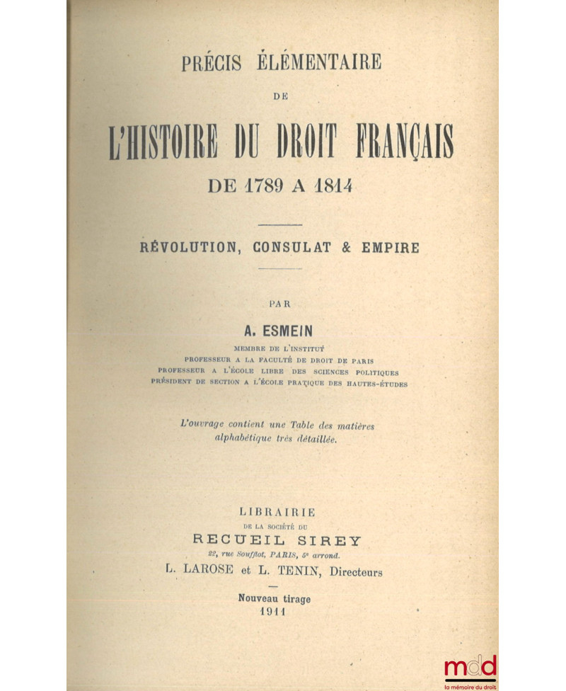 PRÉCIS ÉLÉMENTAIRE DE L’HISTOIRE DU DROIT FRANÇAIS DE 1789 À 1814, RÉVOLUTION, CONSULAT & EMPIRE, avec une Table des matières alphabétique très détaillée