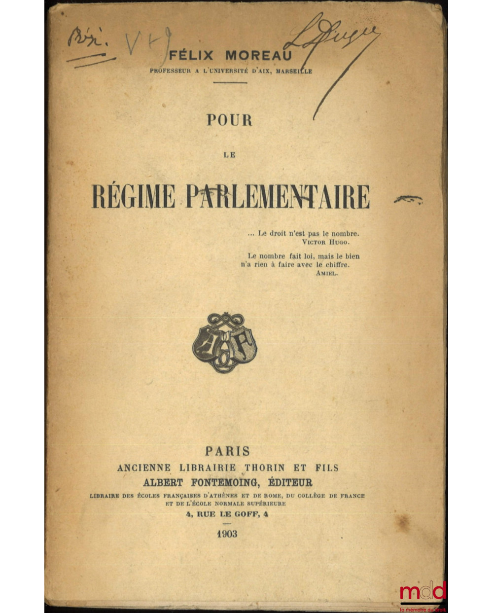 Description : in-8, br., non massicoté, ENVOI DE L’AUTEUR, Ex-libris manuscrit « L. Duguit », (insolé, qq. annotations au crayon), [ce livre provient de la bibliothèque personnelle de Léon DUGUIT], VIII-367 p.