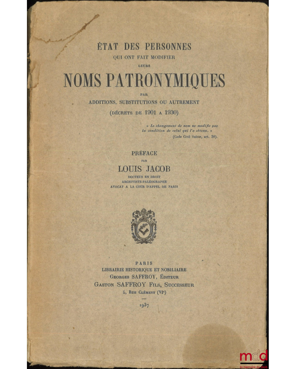 ÉTAT DES PERSONNES QUI ONT FAIT MODIFIER LEURS NOMS PATRONYMIQUES, Par additions, substitutions ou autrement (décrets de 1901 à 1930), Préface par Louis Jacob