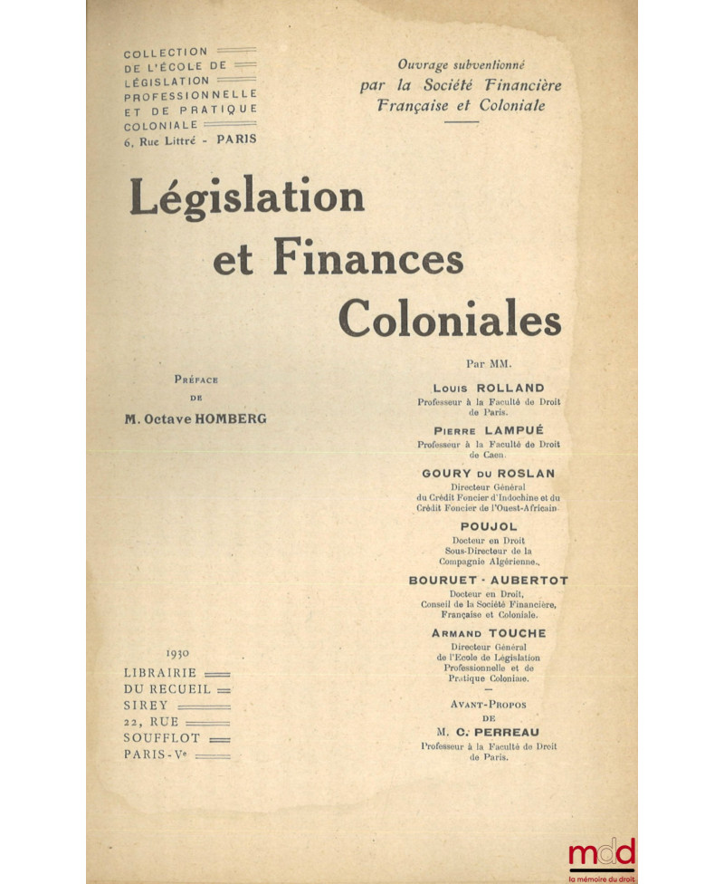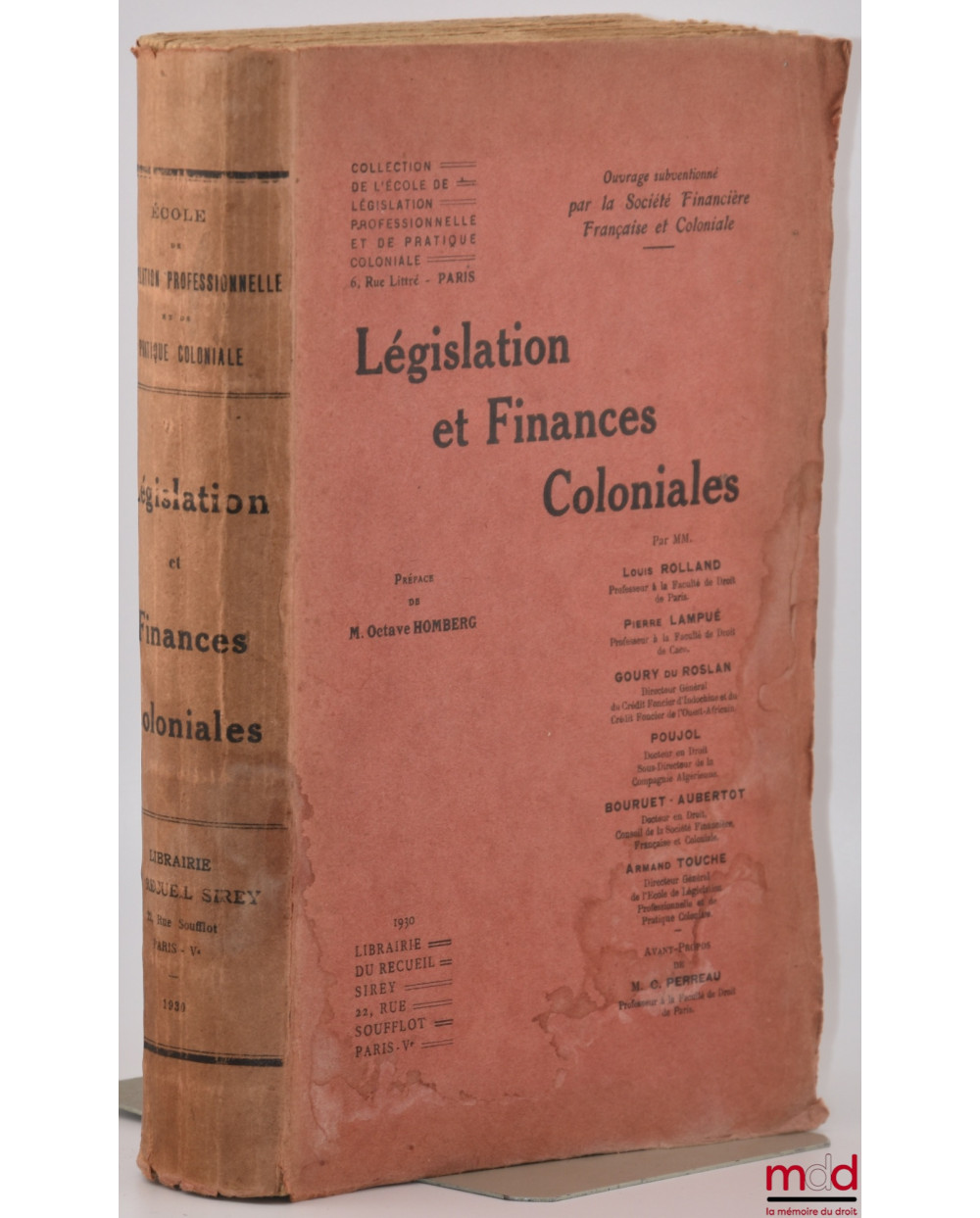 LÉGISLATION ET FINANCES COLONIALES, Préface de Octave Homberg, Avant-propos de C. Perreau