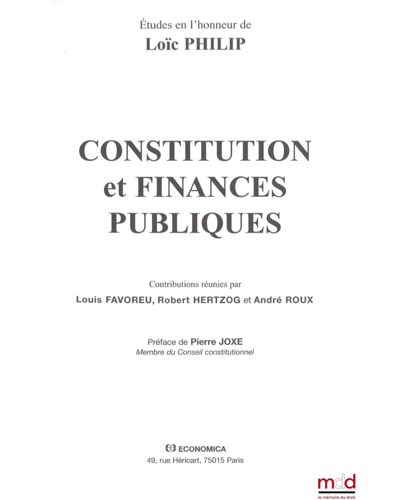 CONSTITUTION ET FINANCES PUBLIQUES, Contributions réunies par Louis Favoreu, Robert Hertzog et André Roux, Préface de Pierre Joxe
