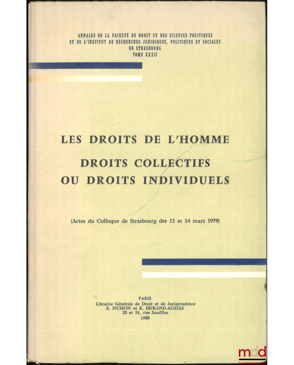 LES DROITS DE L’HOMME, DROIT COLLECTIFS OU DROITS INDIVIDUELS, (Actes du Colloque de Strasbourg des 13 et 14 mars 1979), Annales de la faculté de droit et des sc. pol. et de l’Institut de recherches jur., pol. et soc. de Strasbourg, t. XXXI