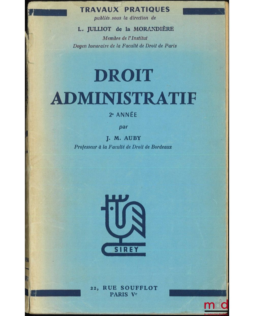 Captivant recueil de travaux pratiques contenant de nombreux plans de dissertations (la grève dans les services publics, recours administratif et recours contentieux), de commentaires d’arrêts (CTC 1955 Rival sur la définition de la voie de fait), de commentaires de textes (loi du 7 juin 1956 relative au délai de recours contentieux en matière administrative) ou de différents contrats administratifs ainsi que d’un certain nombre de cas pratiques. La pensée de l’auteur s’y déploie de manière différente de celle exposée dans ses manuels auxquels elle donne un éclairage original.