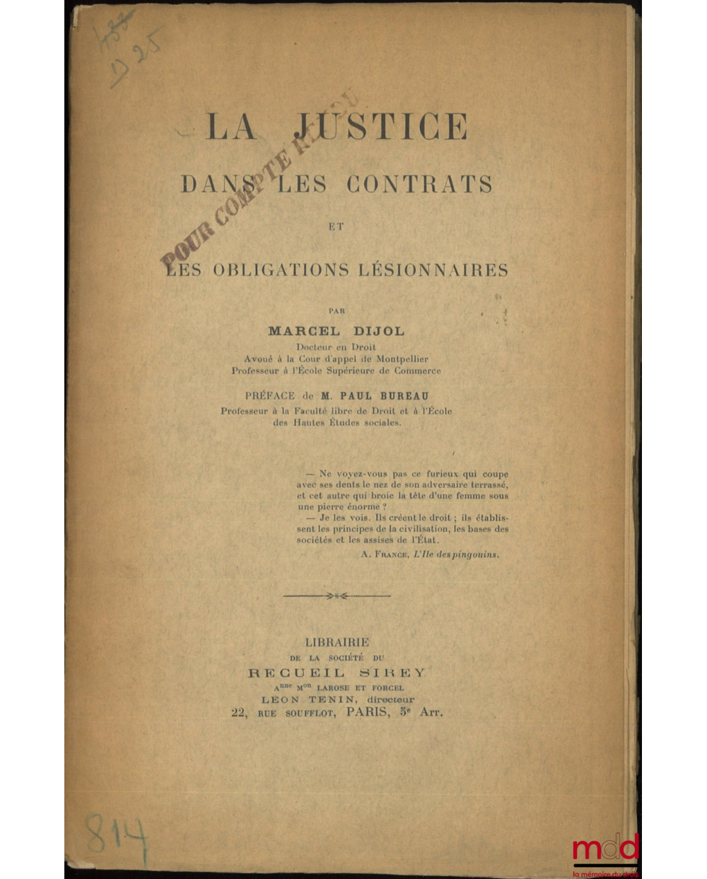 LA JUSTICE DANS LES CONTRATS ET LES OBLIGATIONS LÉSIONNAIRES, Préface de Paul Bureau