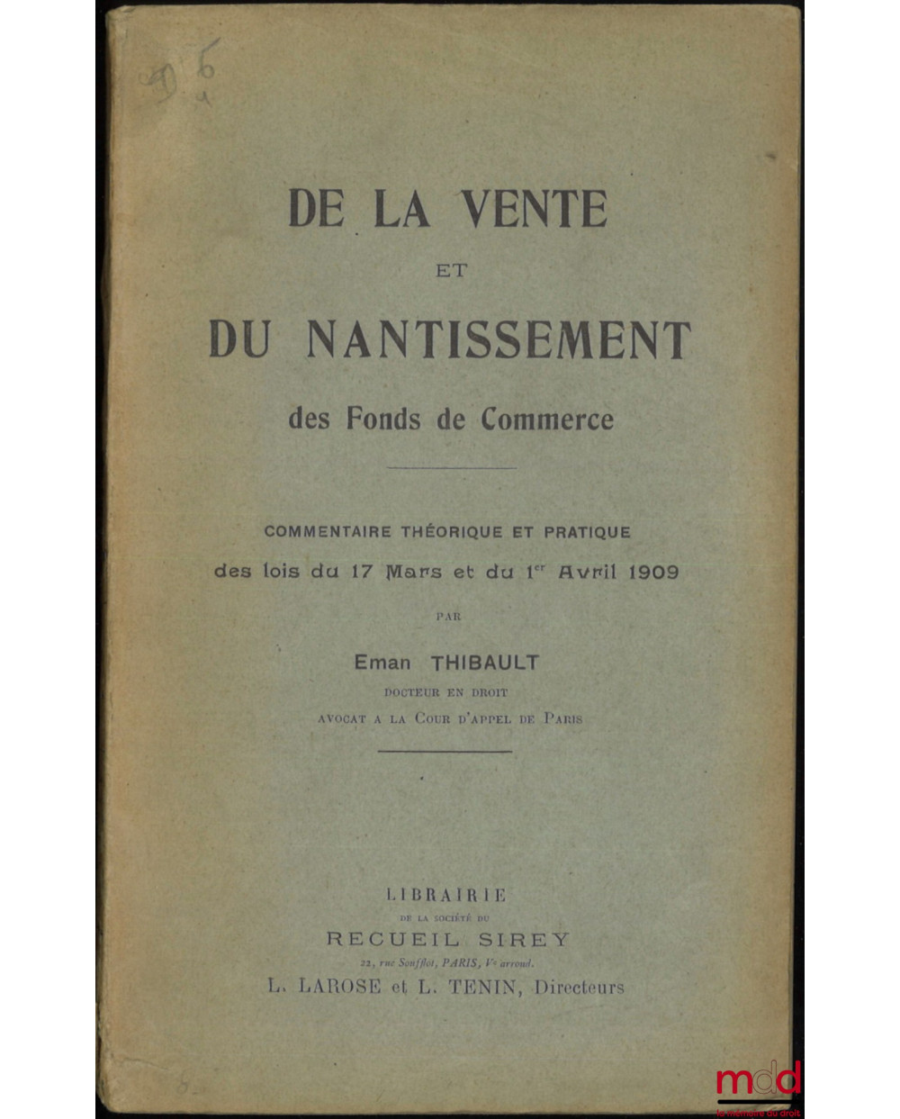 DE LA VENTE ET DU NANTISSEMENT DES FONDS DE COMMERCE, Commentaire théorique et pratique des lois des 17 mars et 1er avril 1909