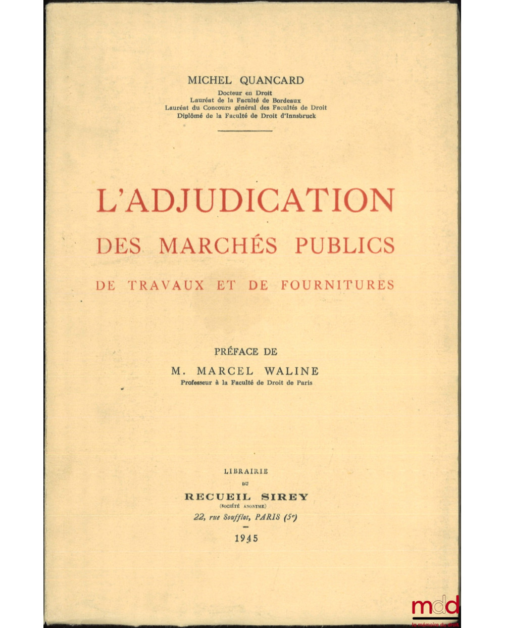 L’ADJUDICATION DES MARCHÉS PUBLICS DE TRAVAUX ET DE FOURNITURES, Préface de Marcel Waline