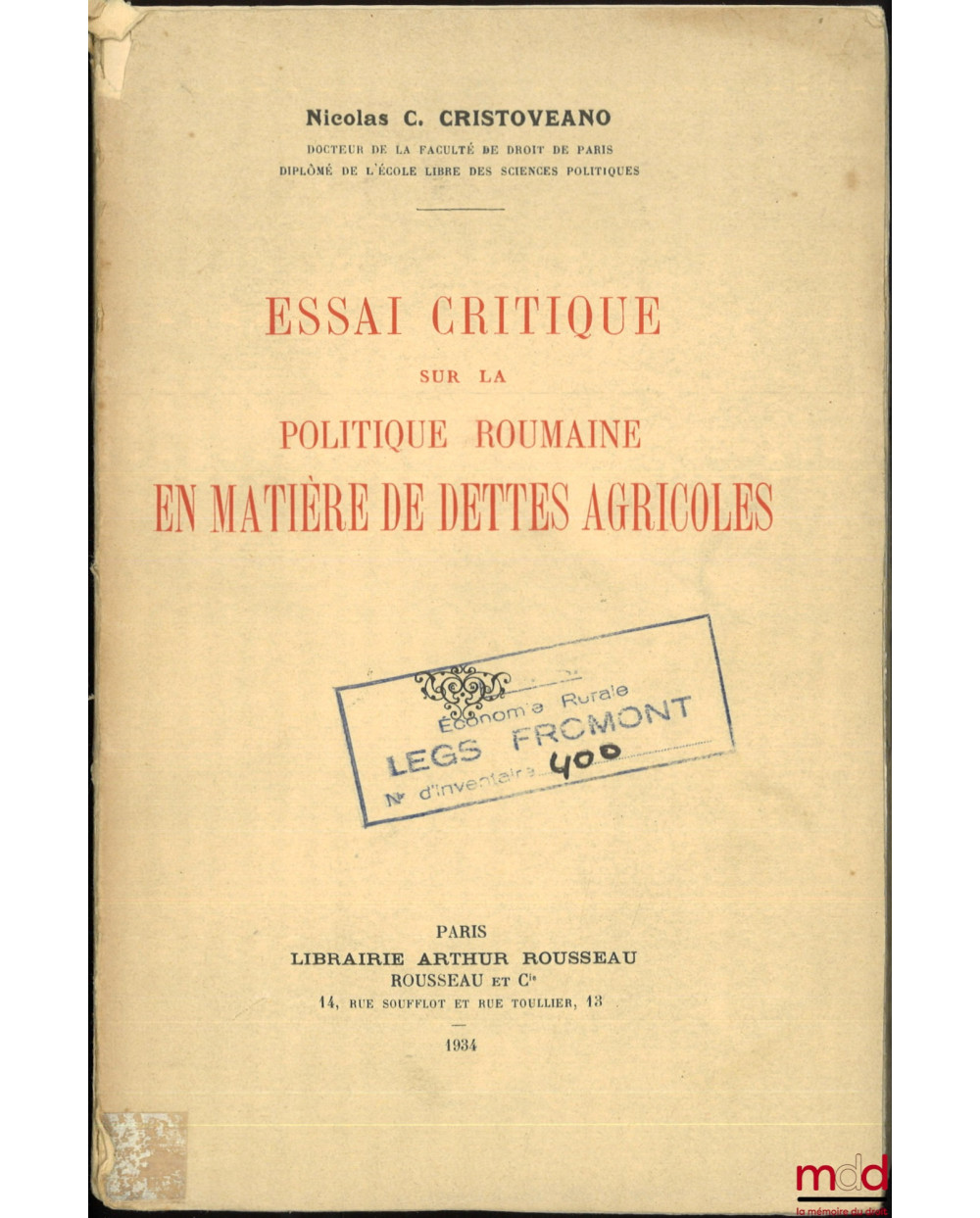 ESSAI CRITIQUE SUR LA POLITIQUE ROUMAINE EN MATIÈRE DE DETTES AGRICOLES
