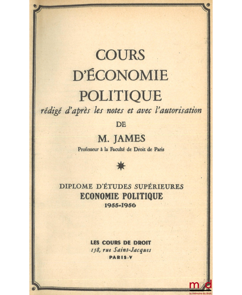 COURS D’ÉCONOMIE POLITIQUE, rédigé d’après les notes et avec l’autorisation de l’auteur, D.E.S. Économie politique, 1955-1956