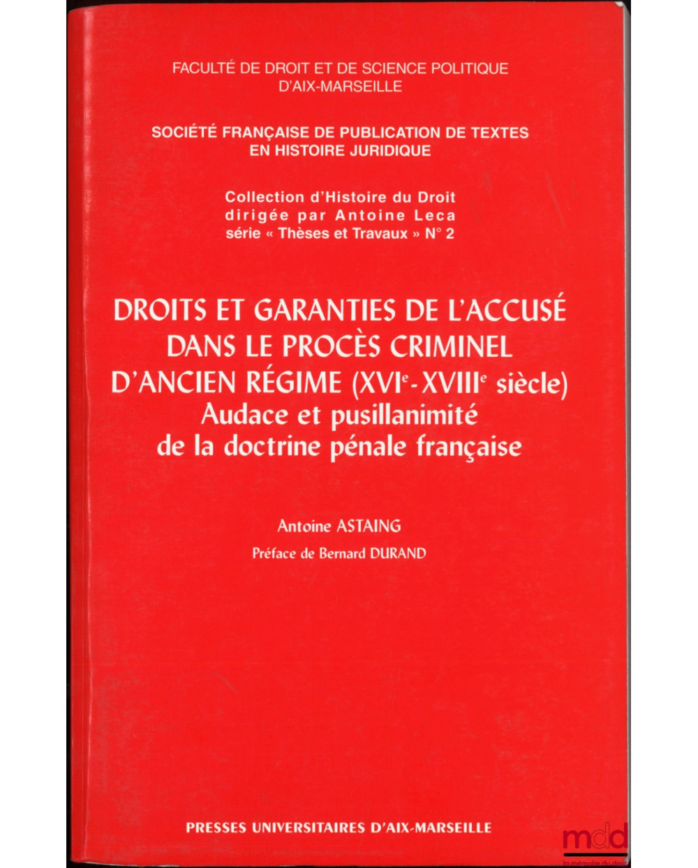 DROITS ET GARANTIES DE L’ACCUSÉ DANS LE PROCÈS CRIMINEL D’ANCIEN RÉGIME (XVIe - VIIIe siècle), Audace et pusillanimité de la doctrine pénale française, Préface de Bernard Durand, Faculté de droit et de Science politique d’Aix-Marseille, Société française de Publication de textes en histoire juridique, coll. d’Histoire du Droit, série « Thèses et Travaux », n° 2