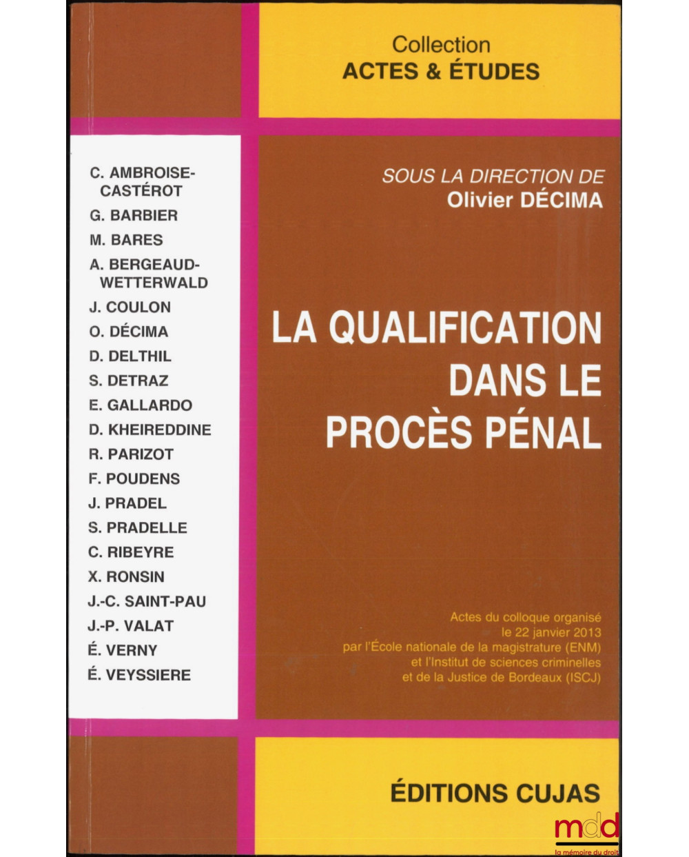 LA QUALIFICATION DANS LE PROCÈS PÉNAL, Actes du colloque organisé le 22 janvier 2013 par l’ENM et l’Institut de Sciences criminelles de Bordeaux, dir. Olivier Décima
