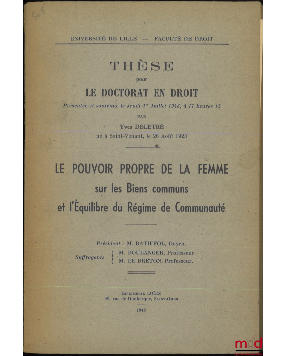 LE POUVOIR PROPRE DE LA FEMME SUR LES BIENS COMMUNS ET L’ÉQUILIBRE DU RÉGIME DE COMMUNAUTÉ, Thèse (Président : M. Batiffol ; Suffragants : M. Boulanger, M. Le Breton), Université de Lille