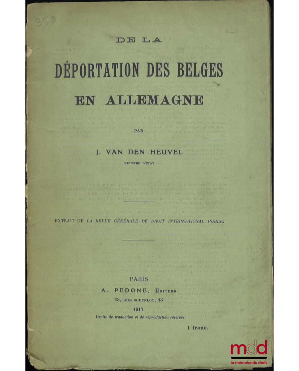 DE LA DÉPORTATION DES BELGES EN ALLEMAGNE, Extrait de la revue générale de droit international public