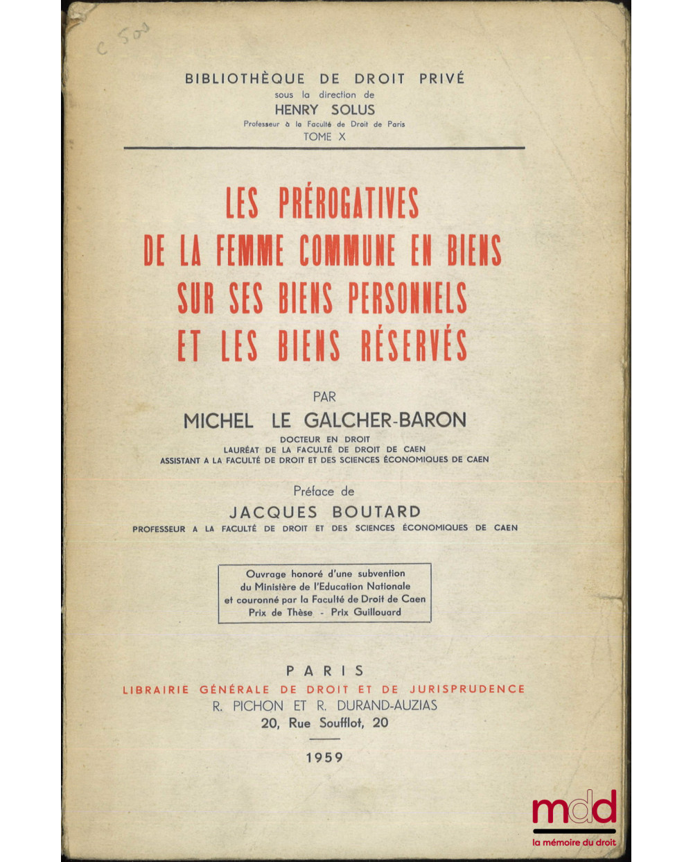 LES PRÉROGATIVES DE LA FEMME COMMUNE EN BIENS SUR SES BIENS PERSONNELS ET LES BIENS RÉSERVÉS, Préface de Jacques BOUTARD, Bibl. de droit privé, t. X