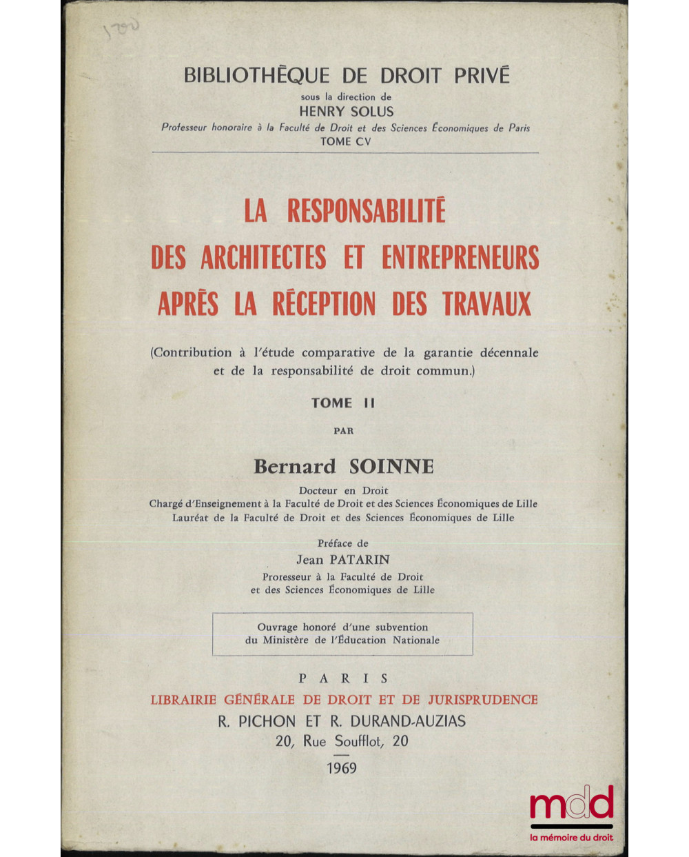 LA RESPONSABILITÉ DES ARCHITECTES ET ENTREPRENEURS APRÈS LA RÉCEPTION DES TRAVAUX (Contribution à l’étude comparative de la garantie décennale et de la responsabilité de droit commun), Préface de Jean Patarin, Bibl. de droit privé, t. CV, [mq. le t. I]
