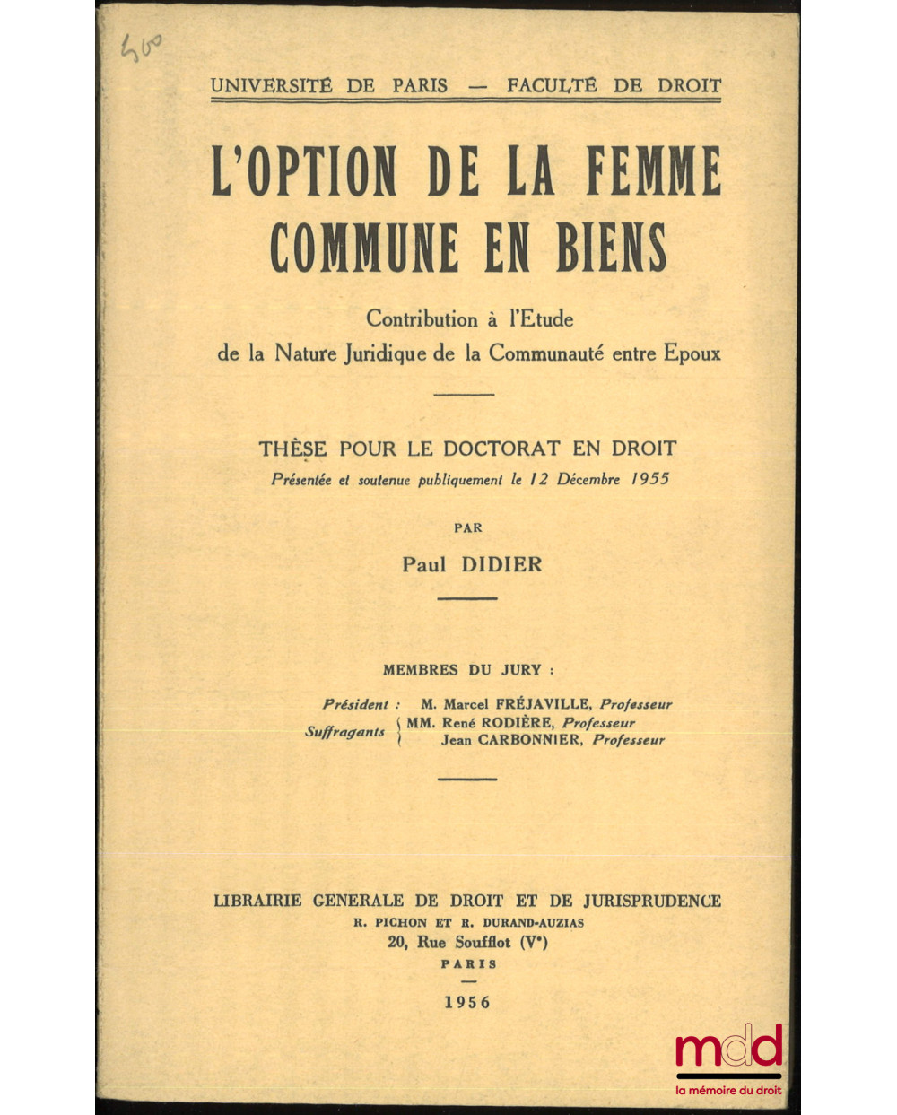 L’OPTION DE LA FEMME COMMUNE EN BIENS, Contribution à l’étude de la nature juridique de la communauté entre époux, Thèse (Président : Marcel Fréjaville ; Suffragants : René Rodière, Jean Carbonnier), Université de Paris - Faculté de droit