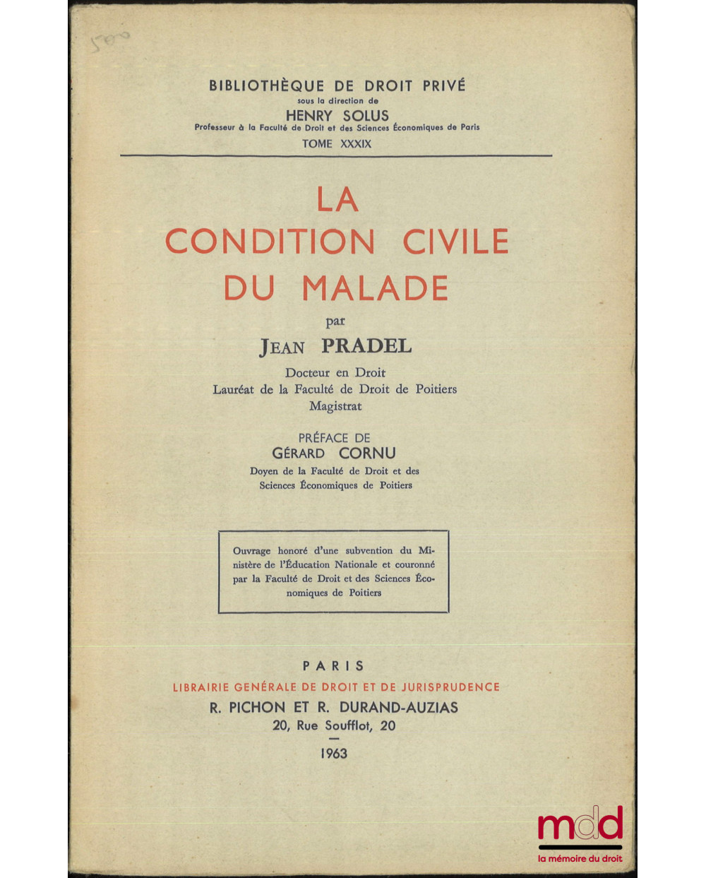 LA CONDITION CIVILE DU MALADE, Préface de Gérard Cornu, Bibl. de droit privé, t. XXXIX