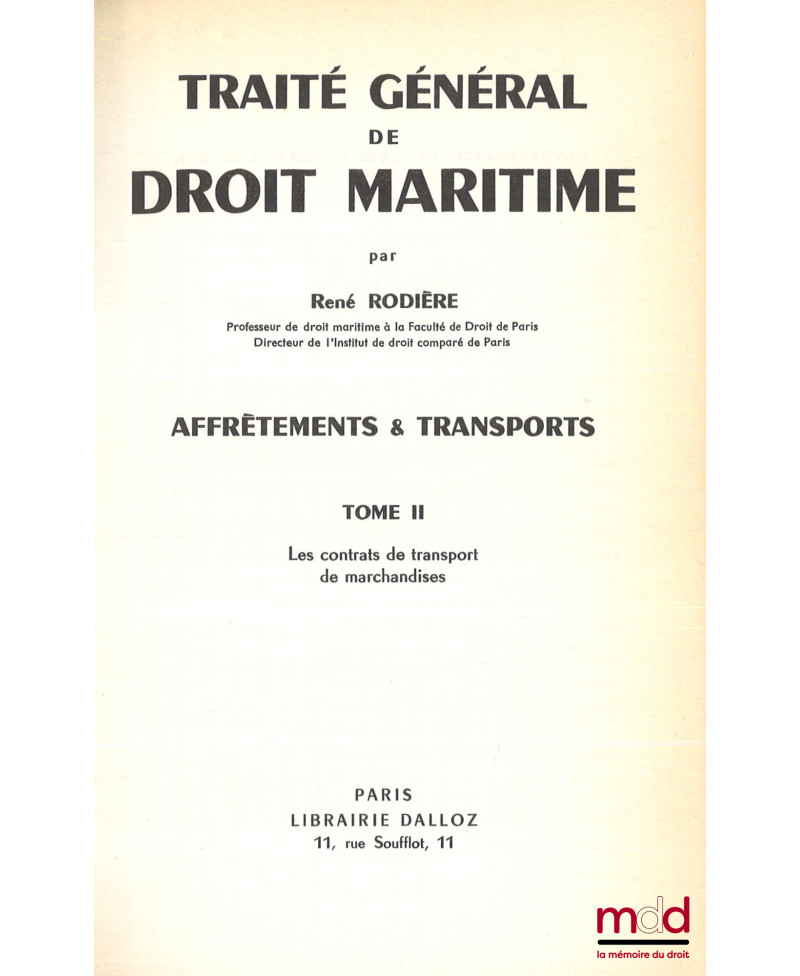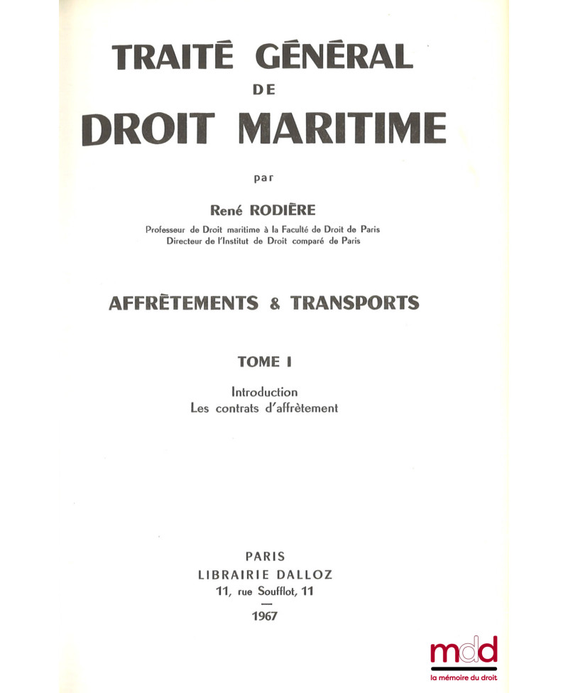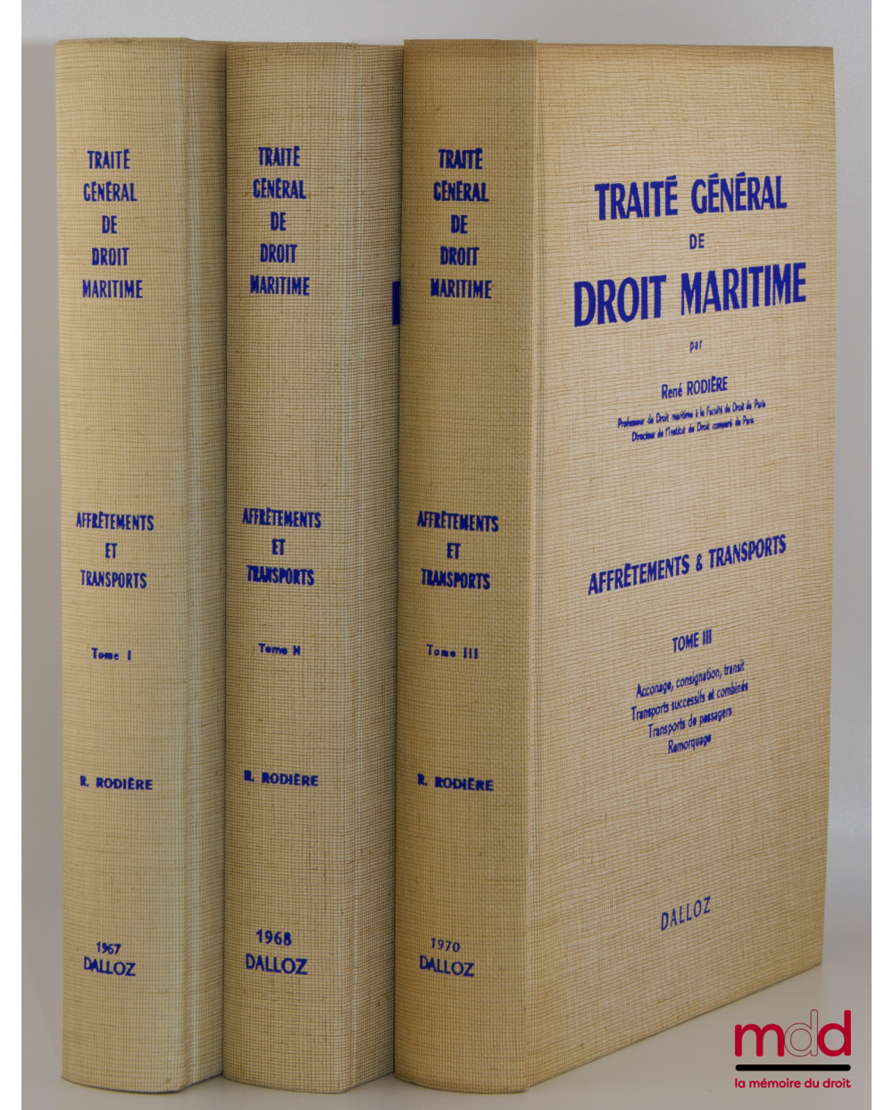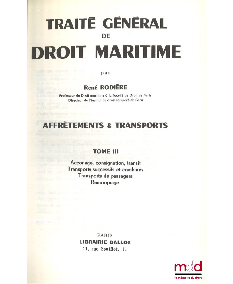 TRAITÉ GÉNÉRAL DE DROIT MARITIME : AFFRÈTEMENTS & TRANSPORTS :t. I : Introduction. Les contrats d’affrètement ;t. II : Les contrats de transport de marchandises ;t. III : Acconage, consignation, transit. Transports successifs et combinés. Transports de passagers. Remorquage ; [mq. t. IV]