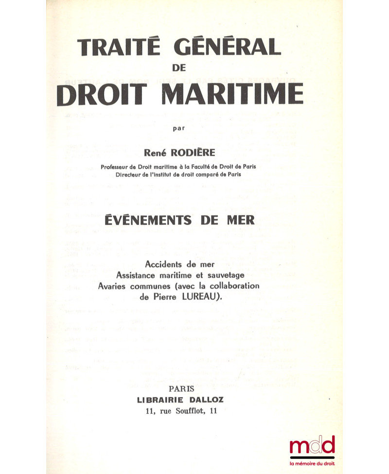 TRAITÉ GÉNÉRAL DE DROIT MARITIME, ÉVÉNEMENTS DE MER, Accidents de mer. Assistance maritime et sauvetage. Avaries communes (avec la collaboration de Pierre LUREAU).