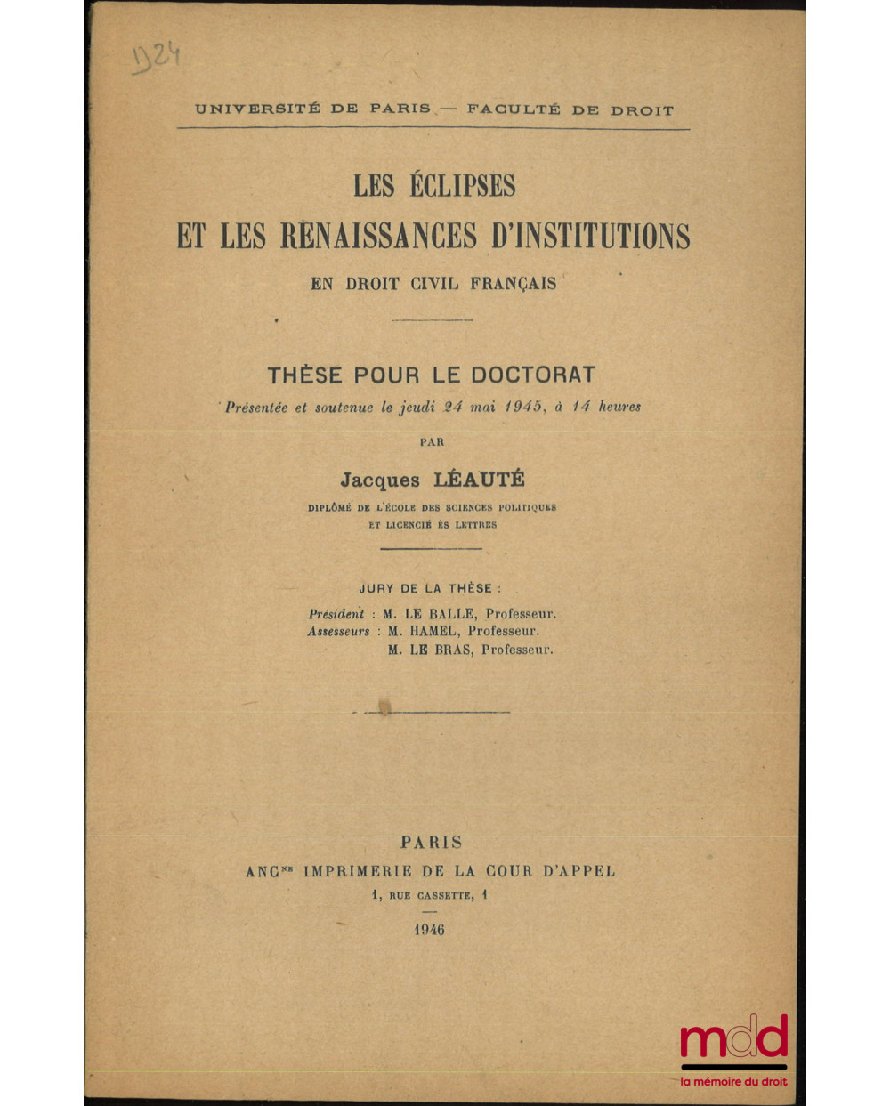 LES ÉCLIPSES ET LES RENAISSANCES D’INSTITUTIONS EN DROIT CIVIL FRANÇAIS, Thèse (Président : M. Le Balle ; Suffragants : M. Hamel, M. Le Bras), Université de Paris - Faculté de Paris
