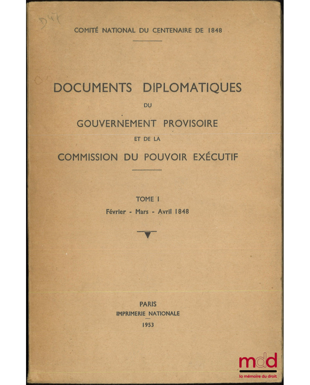 DOCUMENTS DIPLOMATIQUES DU GOUVERNEMENT PROVISOIRE ET DE LA COMMISSION DU POUVOIR EXÉCUTIF, t. I : Février - Mars - Avril 1848