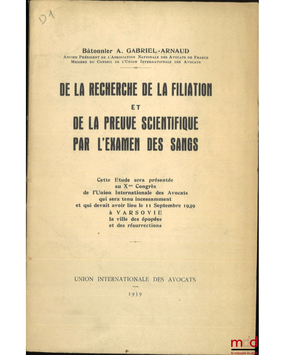 DE LA RECHERCHE DE LA FILIATION ET DE LA PREUVE SCIENTIFIQUE PAR L’EXAMEN DES SANGS