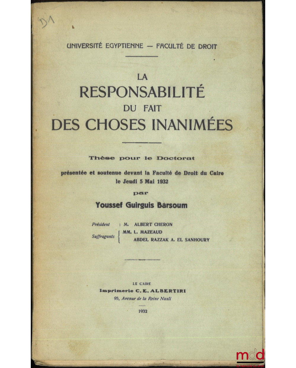 LA RESPONSABILITÉ DU FAIT DES CHOSES INANIMÉES, Thèse, Université Égyptienne - Faculté de droit
