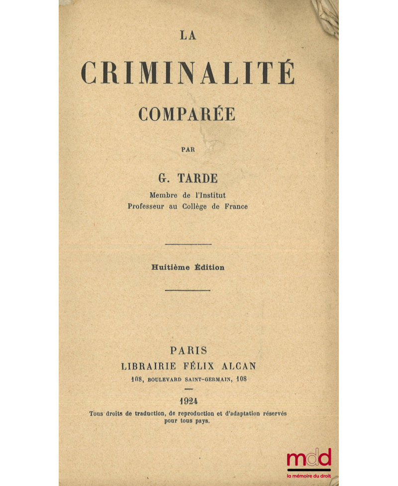On a connu le célèbre auteur plus clairvoyant (v. notamment ses importants textes sur les transformations du droit), mais il cède dans le présent ouvrage au penchant de l’anthropologie criminelle de l’époque avec notamment d’importants développements sur le caractère anatomique du criminel. Plus intéressants sont les développements consacrés d’une part à la réflexion sur le caractère dissuasif de la sanction pénale et d’autre part sur la statistique et la géographie criminelles.