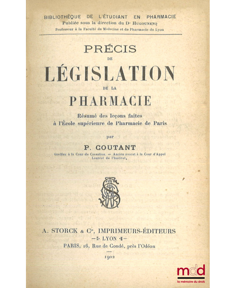LÉGISLATION PHARMACEUTIQUE, Résumé des leçons faites à l’École supérieure de Pharmacie de Paris, Bibl. de l’étudiant en Pharmacie