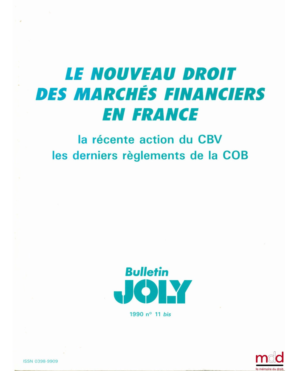 LE NOUVEAU DROIT DES MARCHÉS FINANCIERS EN FRANCE. La récente action du Conseil des Bourses de Valeurs. Les derniers règlements de la Commission des Opérations de Bourse, travaux du séminaire à Paris le 10 octobre 1990 de L’ANDD et ADCFP Paris I, Bulletin Joly n° 11 bis avec la 1re mise à jour à novembre 1990