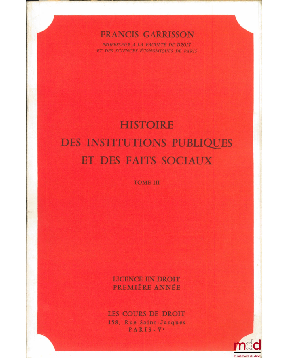 HISTOIRE DES INSTITUTIONS PUBLIQUES ET DES FAITS SOCIAUX, t. III, année 1968, Licence en droit première année : PÉRIODE MONARCHIQUE (temps modernes)