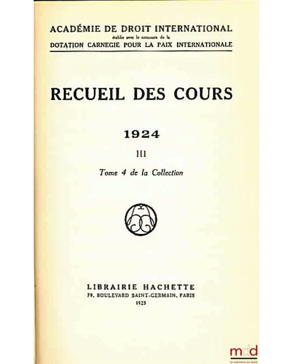 RECUEIL DES COURS, Académie de droit international, 1924 - III, t. 4 de la collection