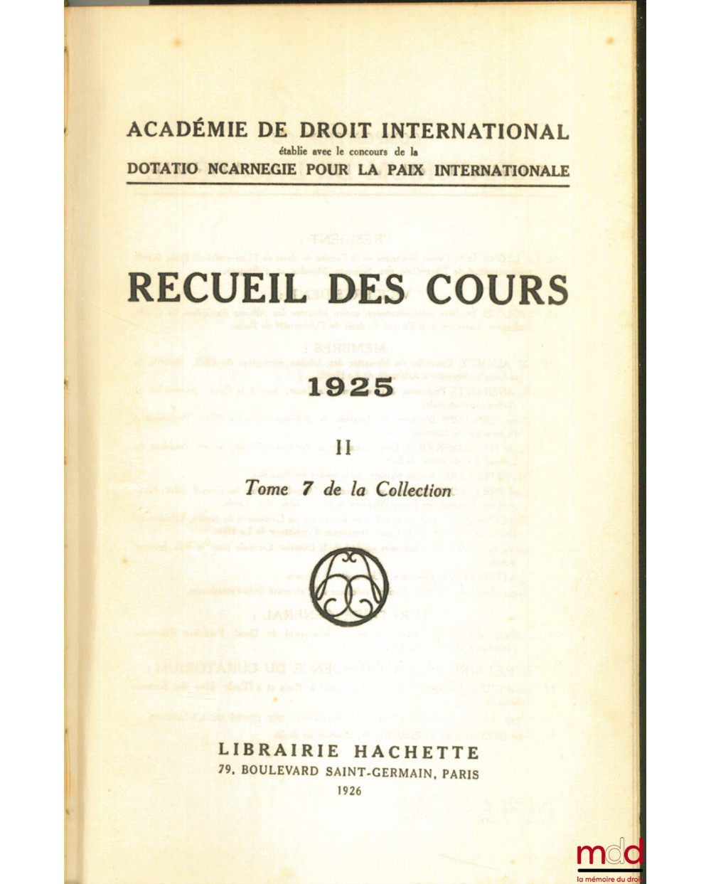 RECUEIL DES COURS, Académie de droit international, 1925 -II, t. 7 de la collection