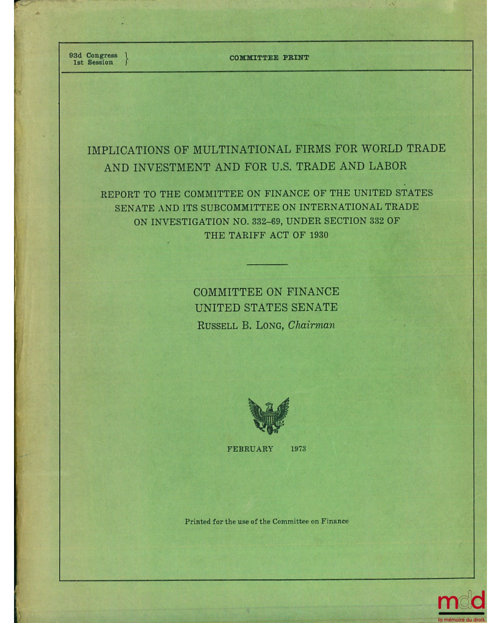 IMPLICATIONS OF MULTINATIONAL FIRMS FOR WORLD TRADE AND INVESTMENT AND FOR U.S. TRADE AND LABOR. Report To the Committee on Finance of the United States Senate and its subcommittee on International Trade on Investigation (…), 93d Congress, 1st Session