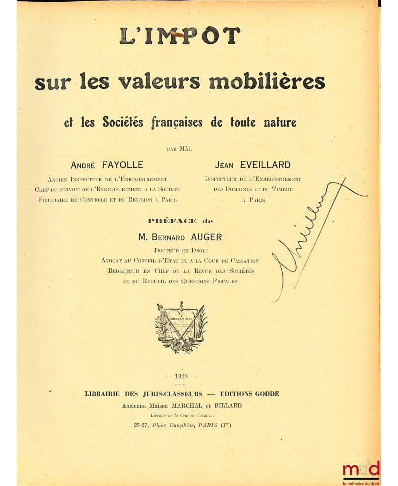 L’IMPÔT SUR LES VALEURS MOBILIÈRES et les sociétés françaises de toute nature, Préface de Bernard Auger