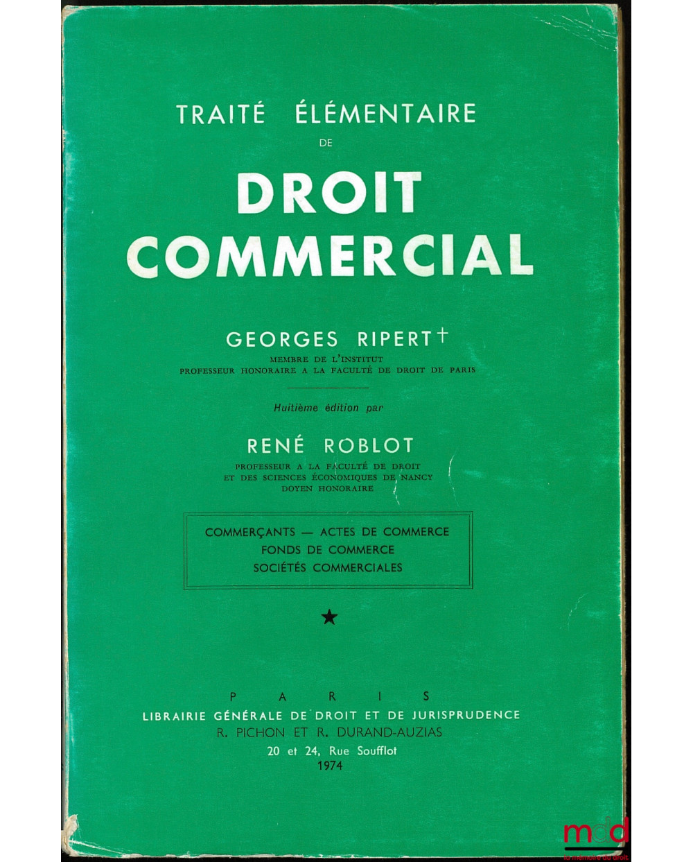 TRAITÉ ÉLÉMENTAIRE DE DROIT COMMERCIAL, 8e éd. par René ROBLOT, t. I : Commerçants - Actes de commerce - Fonds de commerce - Sociétés commerciales