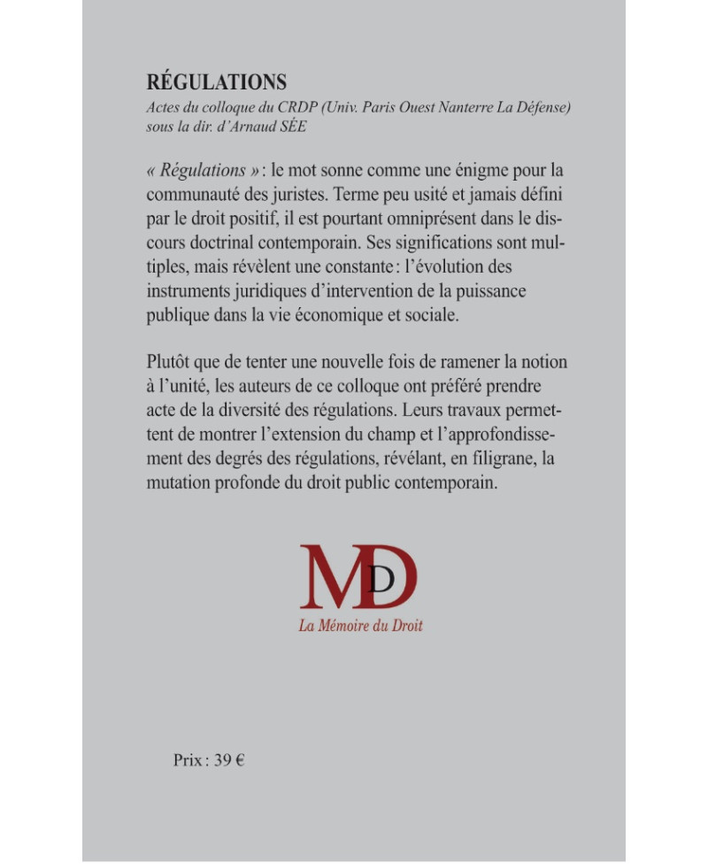 RÉGULATIONSPréface de Bertrand du MaraisActes du colloque organisé par le Centre de Recherche sur le Droit Publicde l’Université Paris Ouest Nanterre La Défense le mercredi 17 octobre 2012
