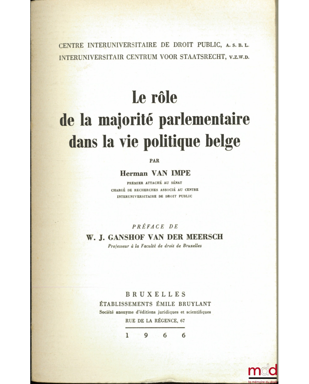 LE RÔLE DE LA MAJORITÉ PARLEMENTAIRE DANS LA VIE POLITIQUE BELGE, Préface de W. J. Ganshof van der Meersch, Centre Interuniverstaire de droit public, A.S.B.L.