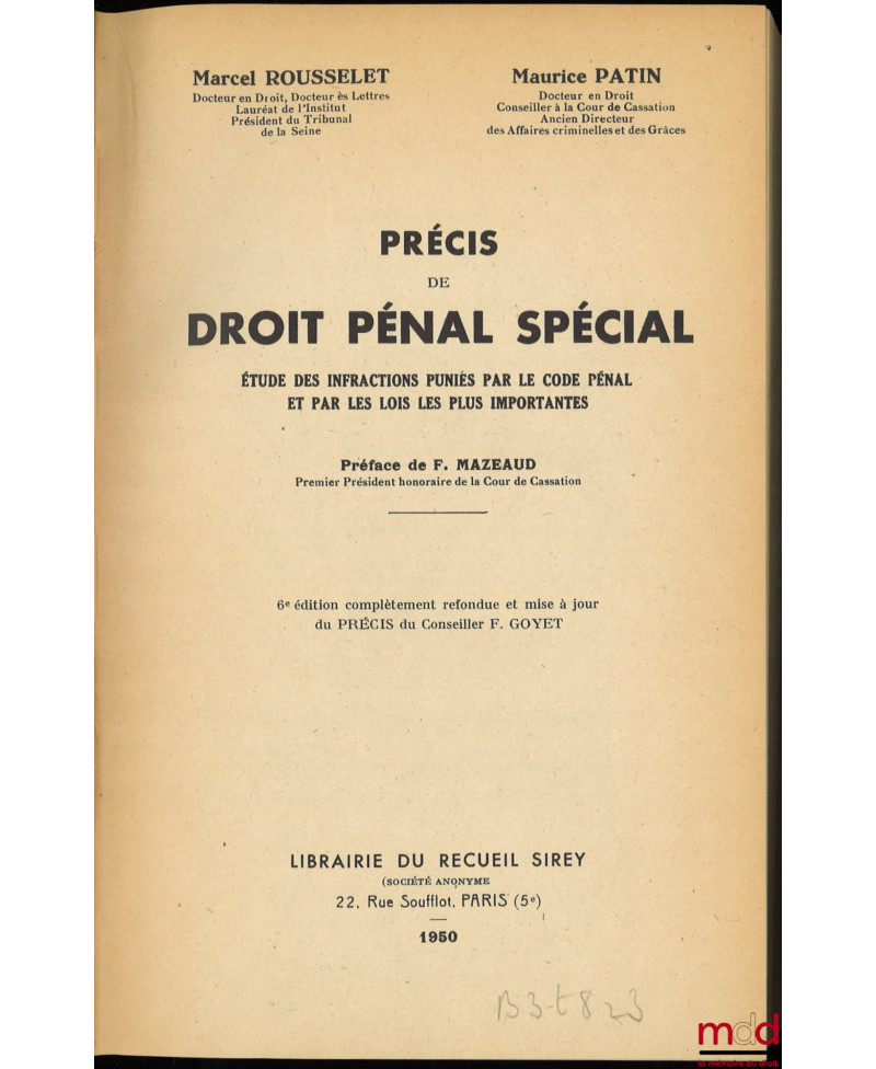 Après avoir poursuivi l’édition du Code pénal annoté d’Émile Garçon, les deux auteurs entreprirent la refonte du Précis de droit pénal spécial de Goyet. Nous avons ici la dernière édition publiée de ce texte de référence.