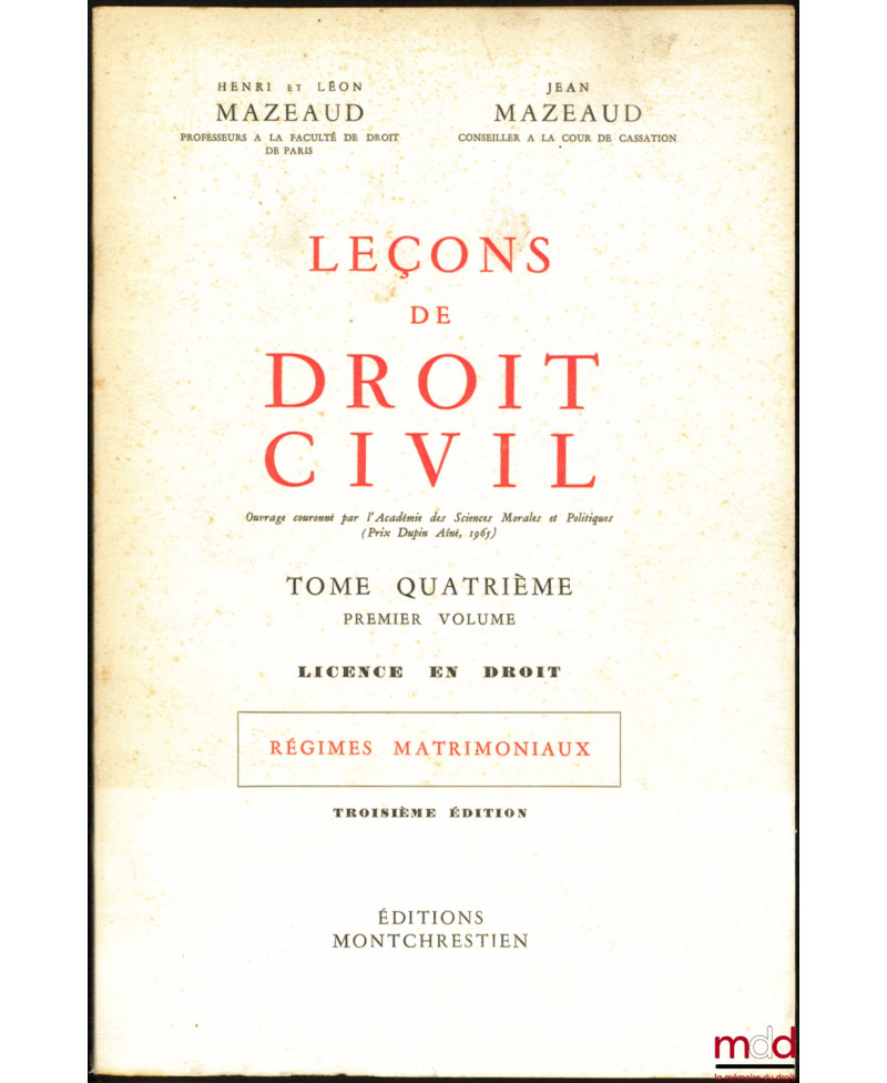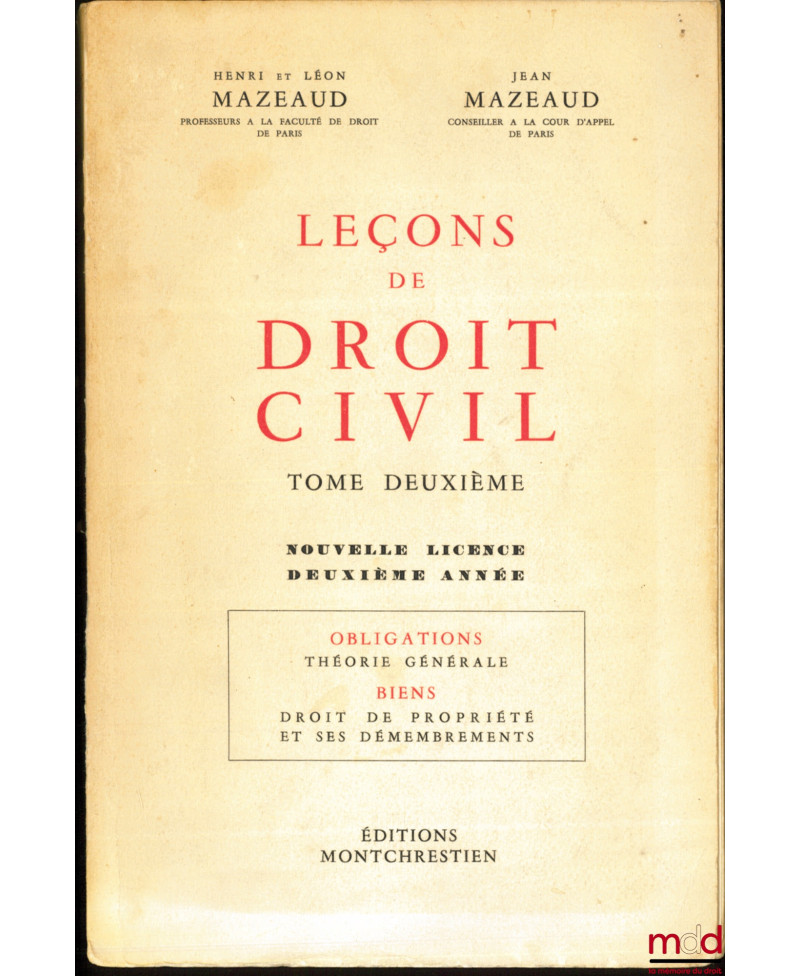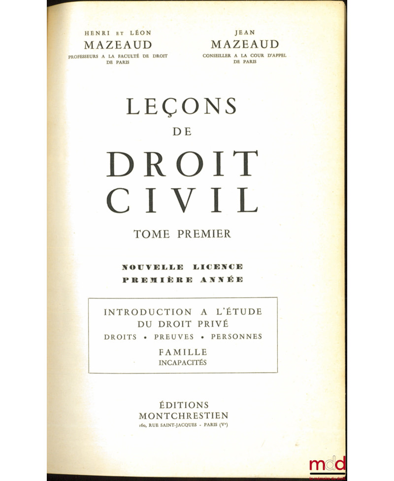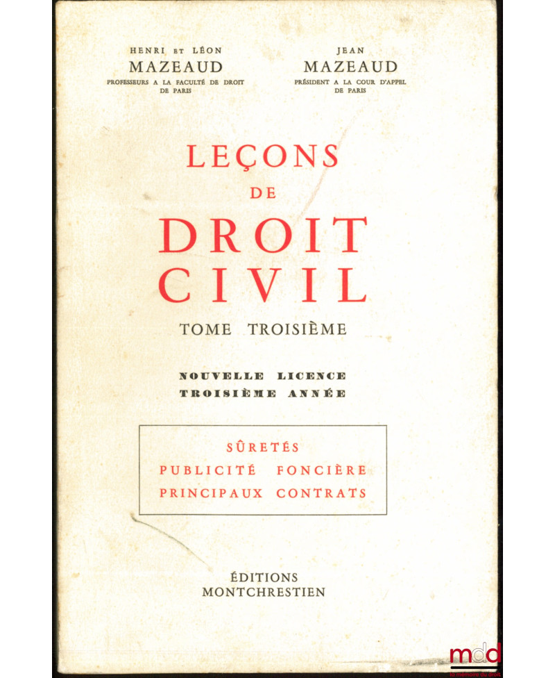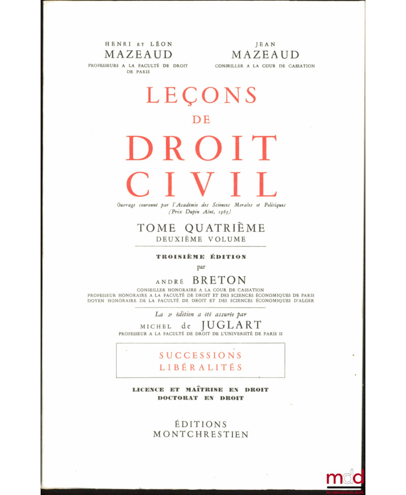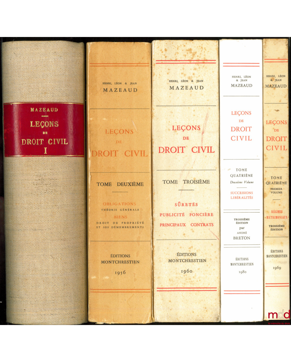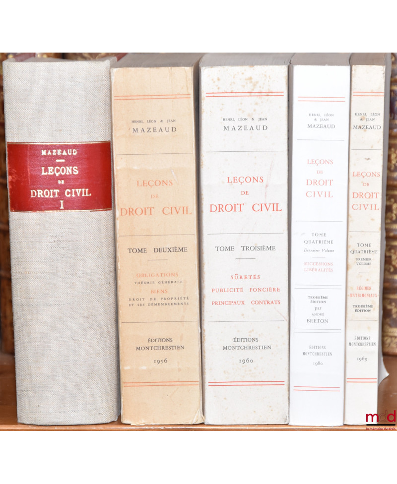 LEÇONS DE DROIT CIVIL :t. I [Nouvelle Licence, Première année] : Introduction à l’étude du droit privé : Droits - Preuves - Personnes, Famille (Incapacités) (1955) ; t. II [Nouvelle Licence, Deuxième année] : Obligations (Théorie générale) ; Biens (Droit de propriété et ses démenbrements), (3e éd., 1956) ;t. III [Nouvelle Licence, Troisième année] : Sûretés - Publicité foncière - Principaux contrats, (1960) ;t. IV-1er vol. [Licence] : Régimes matrimoniaux (3e éd., 1969) ; t. IV-2e vol. : Successions - Libéralités, (3e éd., par André Breton, 1980)