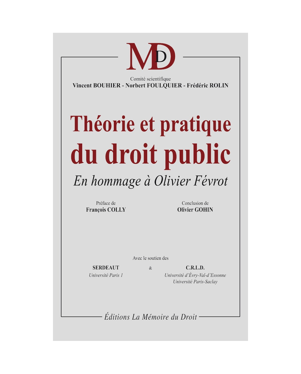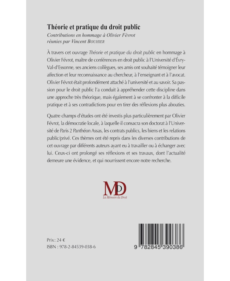 THÉORIE ET PRATIQUE DU DROIT PUBLICEn hommage à Olivier FévrotPréface de François Colly Propos conclusifs de Olivier GohinAvec le soutien du SERDEAUT (Université Paris I) et du C.R.L.D. (Université d’Évry-Val-d’Essonne et Paris-Saclay)