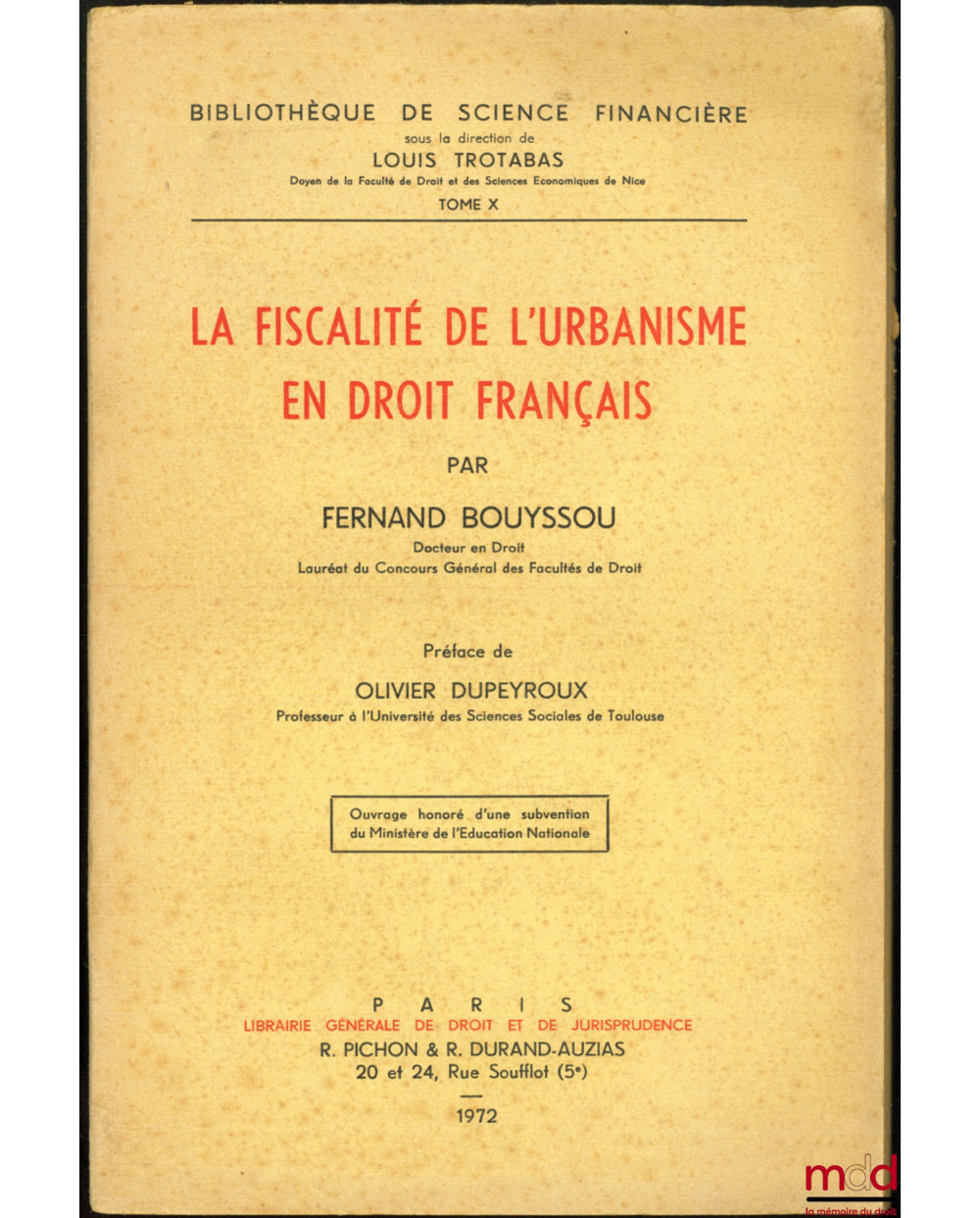 LA FISCALITÉ DE L’URBANISME EN DROIT FRANÇAIS, Préface de Olivier Dupeyroux, Bibl. de sc. financière, t. X